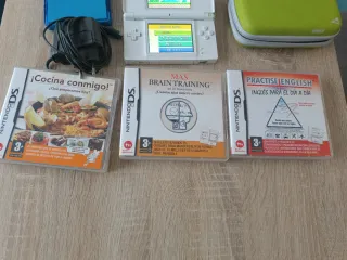 Consola Nintendo DS Lite en color blanco que funciona perfectamente, junto con seis juegos, un estuche protector y un portajuegos. - Juegos incluidos: ¡Cocina conmigo!, Super Mario Bros., Happy Feet, Practise English, Nintendogs y Más Brain Training. - Incluye cargador. - Funda de color verde para la consola con alguna rascada pequeña. - Portajuegos azul. Caben 4 juegos. Aviso: No lleva el lápiz táctil!