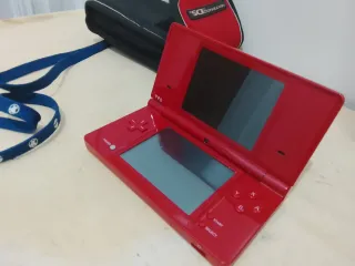 Consola portátil Nintendo DS en color rojo. - Incluye funda de transporte negra y roja. - Correa azul con diseño.