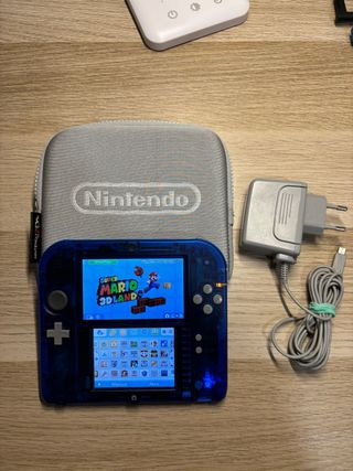 Consola Nintendo 2DS en color azul, incluye muchos juegos, cargador y funda protectora. - Color azul translúcido. - Funda de transporte gris con logo Nintendo. - Cargador