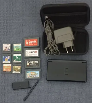 Consola Nintendo DS Lite en color negro, junto con varios accesorios. - Cargador de corriente. - Estuche de transporte. - Lápiz táctil. - 10 cartuchos de juegos: Robots, FIFA 07, Hey Arnold!, y otros 7 juegos.