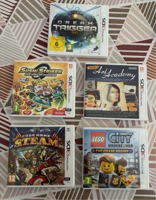Conjunto de cinco videojuegos para Nintendo 3DS. 25e lote o 5e unidad - Sushi Striker: The Way of the Sushi - Dream Trigger 3D - Code Name: Steam - Art Academy - LEGO City Undercover: The Chase Begins