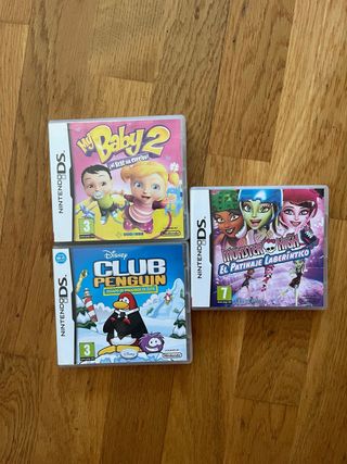 Tres videojuegos para Nintendo DS. - My Baby 2 - Disney Club Penguin - Monster High: El Patinaje Laberíntico Se vende en lote pero hay la posibilidad de venderlo por separado también