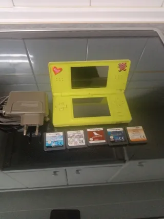 Consola Nintendo DS de color amarillo, con un diseño divertido y dos pegatinas decorativas. - Incluye cargador. - Cinco juegos de Nintendo DS: - Nintendogs - Mario Kart DS - Brain Age - Animal Crossing - New Super Mario Bros.