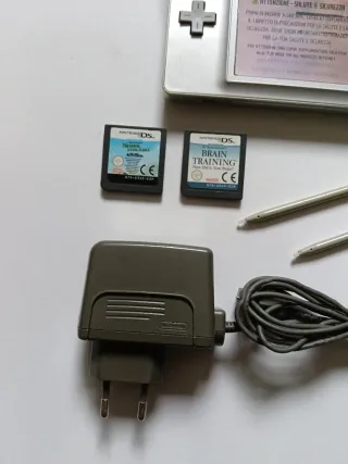 Consola portátil Nintendo DS Lite en color plata. Incluye dos juegos y su cargador. En buen estado aunque tiene unas rayas en la pantalla inferior, que no afectan a su jugabilidad. Incluye lápices . Más artículos similares en mi perfil.