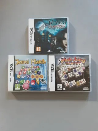 Conjunto de tres videojuegos para Nintendo DS. Con idioma en inglés. Todos como nuevos y completos con manuales - Witches & Vampires: The Secrets of Ashbury - Jewel Match - Mah Jong Expeditions