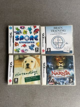 Pack de cuatro videojuegos para Nintendo DS. - Spore Creatures - Brain Training del Dr. Kawashima - Nintendogs Labrador & Friends - Las Crónicas de Narnia: El León, la Bruja y el Armario