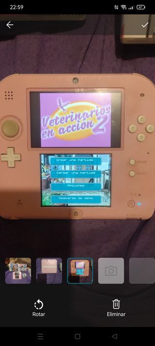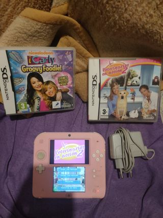 Consola portátil Nintendo 2DS en color rosa, ideal para llevar tus juegos a todas partes. Incluye dos títulos. No incluye lapiz - Juego: iCarly Groovy Foodie! - Juego: Veterinarios en acción 2 - Cargador original la consola tiene unas marcas por detras ver imagenes.