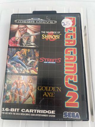 Cartucho de juegos para Sega Mega Drive. ( Sin Manual ) - Incluye los títulos: The Revenge of Shinobi, Streets of Rage y Golden Axe. - Formato: 16-Bit Cartridge. - Diseñado para el sistema de entretenimiento Sega Mega Drive. (Super Nintendo, Snes, Nintendo, Capcom, Ps Vita, psx, play station, play 2, play 3, xbox, 360, nes, sega, psp, psvita, nintendo ds, dsi..Switch 2, Neo Geo...)
