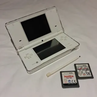 Consola Nintendo DSi de color blanco. Funciona perfectamente. Tanto la pantalla táctil como los botones responden sin ningún tipo de problema, y las cámaras funcionan con normalidad. Incluye carcasa protectora, lápiz original y dos juegos: Mario Kart e Imagina Ser Veterinaria. Las gomas de la pantalla superior son nuevas. La pantalla inferior tiene arañazos superficiales que no afectan de ninguna forma al correcto funcionamiento de ella. La pantalla superior también tiene tres arañazos muy superficiales que apenas se ven. Con la consola encendida, estos arañazos son imperceptibles. SOLO ENTREGA EN PERSONA.