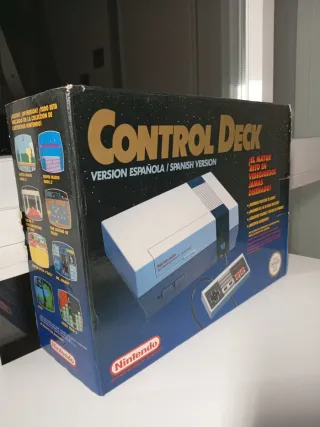 Consola Nintendo Entertainment System (NES) en su versión original española. Diseñada para operar en España. - Incluye el sistema NES. - Diseñada para el mercado español. - Se recomienda usar cartuchos de juegos de la versión española del NES. - Incluye dos mandos - Cable de antena - Alimentador no original - Manual de instrucciones con numero de serie que coincide con el de la consola. - Caja y corchos en estado aceptable para los años que tiene. Sin roturas ni en carton ni corchos. - Funciona perfectamente