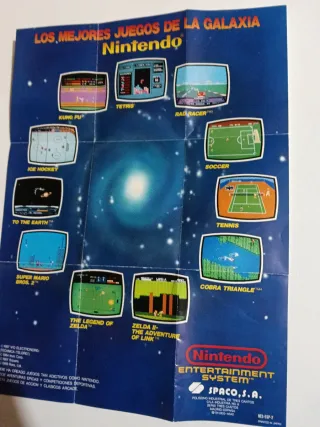 Póster promocional de Nintendo Entertainment System con Los Mejores Juegos de la Galaxia. - Incluye imágenes de Kung Fu, Tetris, Rad Racer, Ice Hockey, Soccer, Tennis, To The Earth, Cobra Triangle, Super Mario Bros. 2, The Legend of Zelda y Zelda II: The Adventure of Link. - Información sobre los derechos de autor de varios juegos. - Fabricado en España por Spaco, S.A.
