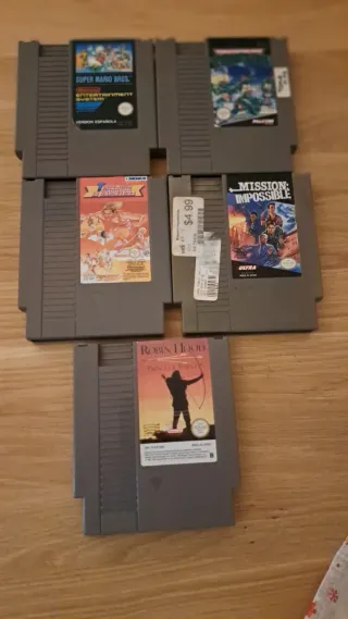 Lote de cinco videojuegos para Nintendo Entertainment System (NES). Super Mario Bros. (Versión Española - Cartucho solo) Track & Field II (Cartucho solo) – El clásico de las olimpiadas de Konami Teenage Mutant Hero Turtles (Cartucho solo) Robin Hood: Prince of Thieves (Cartucho solo) Mission Impossible (Cartucho solo)