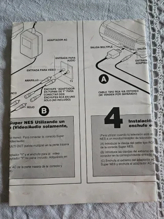 Manual de instrucciones para la consola Super NES, enfocado en la conexión de video y audio. Desplegable,en la parte trasera tiene un póster desplegable de los principales juegos de super nintendo de la época - Incluye diagramas para la conexión de adaptadores. - Explica el uso de la salida múltiple (MULTI OUT). - Detalla la conexión a un televisor o monitor.