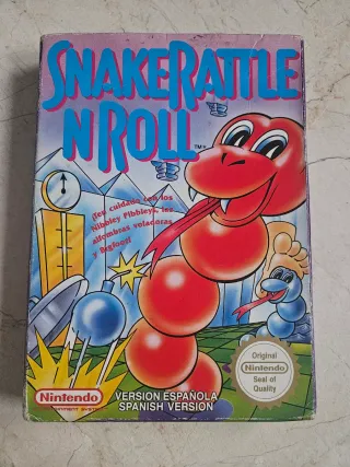 Videojuego para Nintendo NES, Snake Rattle N Roll en su versión española. - Caja original. - Cartucho del juego. - Inserto de poliestireno. - Protector de plástico negro.