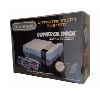 Consola clásica Nintendo NES Mini. - Diseño compacto y retro. - Color gris y negro. - 2 mandos