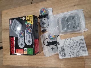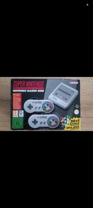 Consola Nintendo Super Entertainment System Classic Mini. Incluye dos mandos. - 20+1 juegos preinstalados. - Incluye dos mandos Super Nintendo. - Diseño retro. - Usado sólo una vez y luego guardado hasta hoy, todo en perfecto estado incluso la caja.