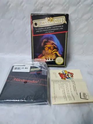 Juego The Chessmaster para Nintendo NES. Incluye caja original y manual. - Caja con imagen de un mago y texto en español. - Manual de instrucciones con diseño de Mario. - Precio original de 19.95€ visible en etiqueta.