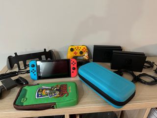 Consola Nintendo Switch con los siguientes accesorios: - Accesorios originales: consola, 2 joy-con, base de carga (dock), fundas para los joy-con, soporte para convertir los joy-con en mando y cargador. - Dock adicional con cargador y HDMI. - Funda blanda de Zelda. - Funda de viaje rígida azul. - Mando adicional de Donkey Kong. La consola esta prácticamente nueva y en perfecto estado. Tiene cristal templado instalado para proteger la pantalla. Únicamente tiene unas 350horas de uso.