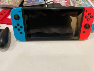 Consola Nintendo Switch con accesorios y juegos. - Incluye: - Juegos: Just Dance 2020, FIFA 18, FIFA 19, FIFA 20, Splatoon 2. - Accesorios: Funda de transporte, carcasa roja, dos volantes (uno azul y uno rojo), base de carga y adaptadores.