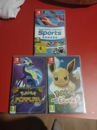 Tres videojuegos para Nintendo Switch. - Nintendo Switch Sports - Pokémon Púrpura - Pokémon: ¡Let's Go, Eevee!