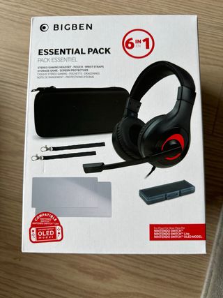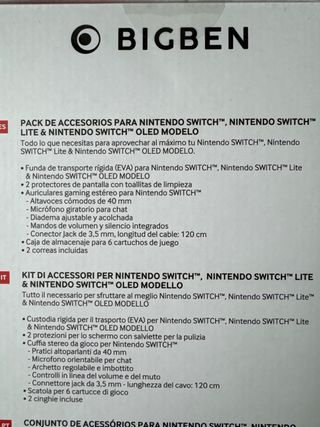 Funda de transporte rígida (EVA) para Nintendo SWITCH™, Nintendo SWITCH™ Lite & Nintendo SWITCH™ OLED MODELO 2 protectores de pantalla con toallitas de limpieza Auriculares gaming estéreo para Nintendo SWITCH™ - Altavoces cómodos de 40 mm - Micrófono giratorio para chat - Diadema ajustable y acolchada - Mandos de volumen y silencio integrados - Conector Jack de 3,5 mm, longitud del cable: 120 cm Caja de almacenaje para 6 cartuchos de juego 2 correas incluidas Caja precintada - en tienda son 50€