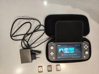 Consola Nintendo Switch Lite en color gris, perfecta para llevar a todas partes. Incluye su cargador original y una funda protectora. Todos los juegos en su caja original - Consola Nintendo Switch Lite. - Cargador original. - Funda protectora. Se vende a 130€ con un juego a elegir entre los tres. Cada juego que se quiera añadir son 20€ más.