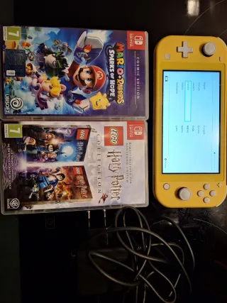 Consola Nintendo Switch Lite en color amarillo, junto con dos juegos. - Incluye tarjeta Micro SD de 128GB. - Juego: Mario + Rabbids Sparks of Hope. - Juego: LEGO Harry Potter Collection.