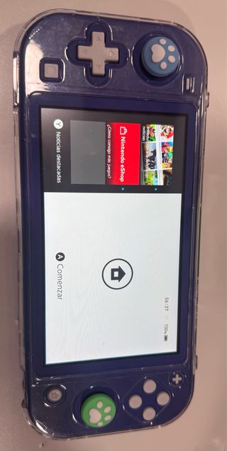 Consola Nintendo Switch Lite en color azul, con accesorios. - Incluye 2 juegos. - Funda protectora transparente. - Protector de pantalla - Joysticks con diseño de huella de pata. - Estuche para transporte