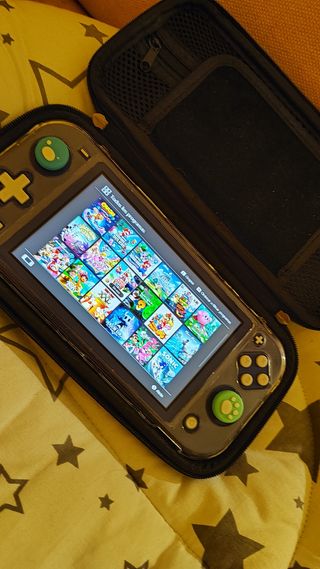 Consola Nintendo Switch Lite en color verde, ideal para llevar tus juegos a todas partes. Incluye una funda protectora - Funda de transporte negra. está en perfectas condiciones