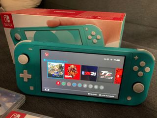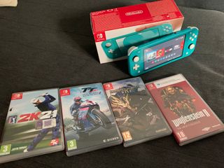 Nintendo Switch Lite en color turquesa con su caja. En muy buen estado. Incluye una tarjeta microSD de 256 GB. Viene con los juegos Monster Hunter Rise, PGA Tour 2K21, Wolfenstein II: The New Colossus y TT Isle Of Man 2: Ride On The Edge. Incluyo funda y protector.