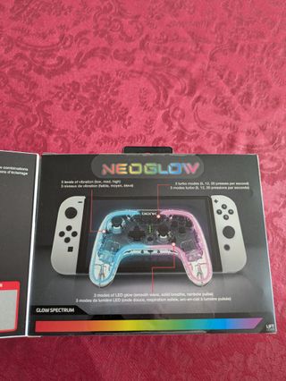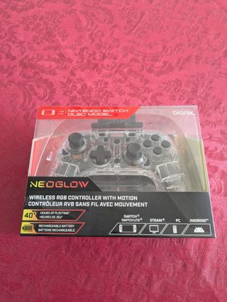 Mando inalámbrico Bionik Neoglow para Nintendo Switch OLED. - Diseño transparente con iluminación RGB. - Compatible con Nintendo Switch, Switch Lite, Steam, PC y Android. - Batería recargable.
