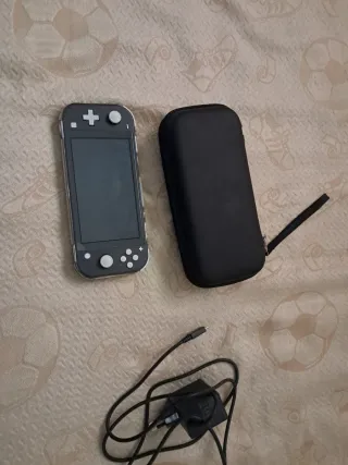 Consola Nintendo Switch Lite en color gris, ideal para llevar contigo a todas partes. Incluye funda protectora y cargador. - Funda de transporte negra. - Cargador de corriente.
