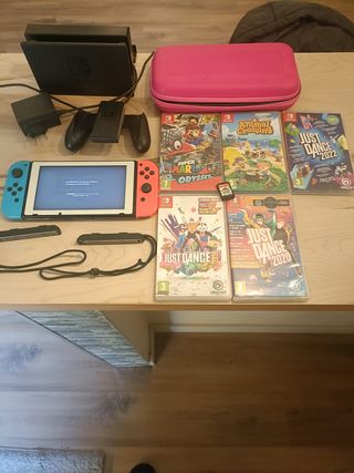Consola Nintendo Switch en buen estado, lista para jugar. Incluye varios títulos populares. - Super Mario Odyssey - Animal Crossing: New Horizons - Just Dance 2022 - Just Dance 2019 - Just Dance 2020 - Mario party( sin caratula) - Funda de transporte rosa - Mandos Joy-Con - Base de carga y adaptadores