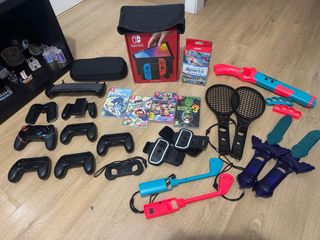 Consola Nintendo Switch con varios accesorios para ampliar tu experiencia de juego. - Nintendo con todo - Incluye juegos: Super Mario Party, MySims Cozy Bundle, EA Sports FC 24, Mario Kart (físicos), Sports (digital). - 4 Mandos Joy-Con de colores (rojo, azul, verde neón). - Volantes para juegos de carreras (rojo y azul). - Mando Pro Controller. - Base de carga y adaptadores. Todo en conjunto 350€ aunque negociable, si se quiere algo suelto mándame un mensaje
