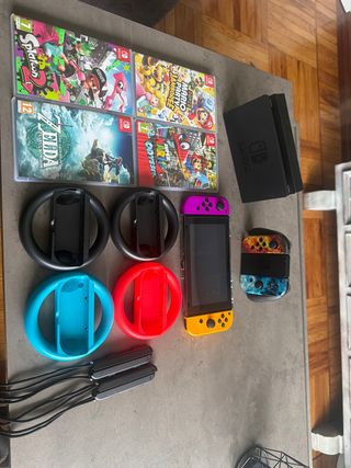 (PRECIO NO NEGOCIABLE)Consola Nintendo Switch con varios juegos y accesorios. - Juegos incluidos: Splatoon 2, The Legend of Zelda: Tears of the Kingdom, Super Mario Party Jamboree, Super Mario Odyssey. - Accesorios: 2 mandos de volante (uno azul, uno rojo), 2 mandos de volante negros, 2 Joy-Con (morado y naranja), 2 Joy-Con (con diseño de fuego y hielo), base de carga para Joy-Con, y la consola Nintendo Switch. - Incluye cables.