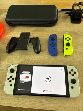 Consola Nintendo Switch modelo OLED en color Neon. Incluye juegos.. - Pantalla OLED de 7 pulgadas. - Base para carga y conexión. - Joy-Con en colores azul y rojo. - Soporte ajustable. Funda para guardarla Protector de pantalla I lo de los juegos preguntar i os digo Esta como el primer dia muy cuidada siempre en su funda i protector