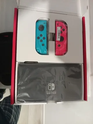 Consola Nintendo Switch OLED en color Neon, completamente nueva y sin usar. Incluye todos los accesorios originales. - Modelo OLED con pantalla vibrante. - Joy-Con en colores Azul y Rojo. - Base de carga y cables incluidos. - Funda protectora de transporte. - Tres juegos de Nintendo Switch. - Uno comprado dentro de la propia tienda de la consola