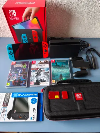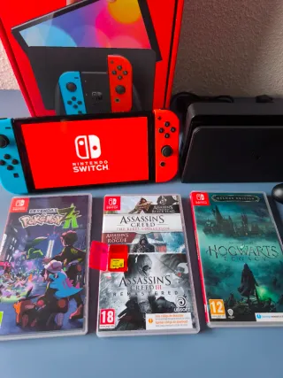 Consola Nintendo Switch OLED en color azul y rojo. Incluye todos sus accesorios originales. -Memoria SD 256 GB - Juego: Hogwarts Legacy. - Juego: Assassin's Creed III Remastered. - Juego: Assassin's Creed Rogue. - Juego: Leyendas Pokémon: ZA. - Estuche de transporte. - Protector de pantalla de cristal templado. - Base de carga. - Joy-Con (L) azul y (R) rojo. - Adaptador de corriente. - Cable HDMI. - Correa para Joy-Con. - Soporte para Joy-Con.