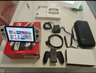 Consola Nintendo Switch OLED en color blanco, incluye: - 5 juegos - Cuatro mandos Joy-Con originales. - Dos soportes para mandos. - Dos volantes para juegos de carreras. - Funda de transporte negra. - Base de carga para mandos. - Cargador y base de carga. - Comprada en diciembre de 2024