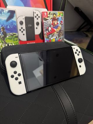 Consola Nintendo Switch OLED en color blanco, con dos videojuegos y funda. Estado: COMO NUEVO, IMPECABLE. Los accesorios de sobremesa practicmente sin utilizar. - The Legend of Zelda: Breath of the Wild - Super Mario Odyssey - Incluye funda protectora. Se ha usado menos de 1 mes en total.