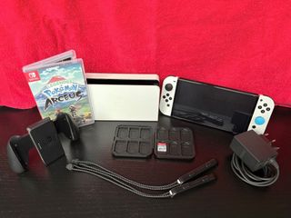 Consola Nintendo Switch modelo OLED en color blanco, con todos sus accesorios originales. - Incluye juego Pokémon Legends: Arceus. - Dock para carga y conexión a TV. - Joy-Con con agarre. - Cargador de corriente. - Estuche para tarjetas de memoria.