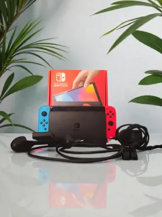 Nintendo Switch modelo OLED, en muy buen estado y funcionando perfectamente. Incluye todos los accesorios originales: dock, grip, correas, cargador, cable HDMI y Joy‑Con rojo/azul. La pantalla OLED se ve increíble, con colores mucho más vivos que el modelo normal.