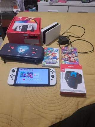 LA VENDO O LA CAMBIO POR SU MISMO VALOR. Consola Nintendo Switch OLED en color blanco, con sus accesorios originales y juegos. - Incluye funda de transporte con diseño. - Juegos: Super Mario Bros. Wonder y Mario Kart 8 Deluxe. - Base de carga y adaptadores. - Correa para mando.