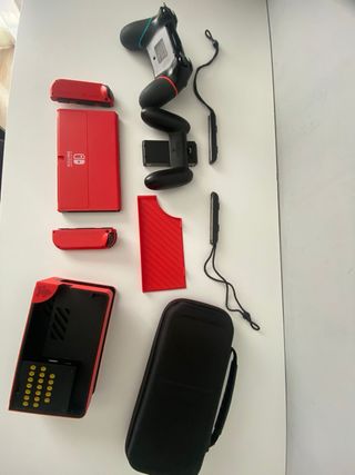 Consola Nintendo Switch modelo OLED. Está prácticamente nueva, conserva la caja y los plásticos originales. Incluye todos los accesorios originales e incluso algunos ni se han utilizado. Se vende con funda de Mario Bros, limpiador de pantalla y tarjeta microSD. - Joy-Con azul. - Joy-Con rojo. - Cargador. - Dock para televisión. - Mando inalámbrico Joy-Con. - Cable HDMI. - Grips de los Joy-Con.