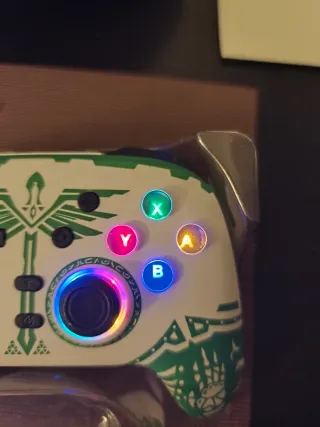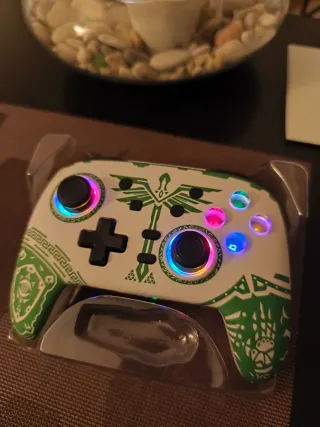 Mando de Nintendo Switch con un diseño único inspirado en The Legend of Zelda. - Diseño blanco con detalles en verde. - Botones frontales con iluminación LED. - Sticks analógicos con aro de luz LED.