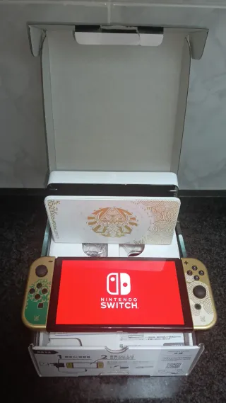 Consola Nintendo Switch OLED con diseño especial de The Legend of Zelda: Tears of the Kingdom. - Incluye todo. * ESTADO: Muy bueno (nunca usado, sólo dejado en estantería cómo adorno). La Caja está un poco picada por las esquinas, sin importancia. * En el Futuro está edición será muy cotizada. - Motivo de la Venta: Mudanza de Casa.