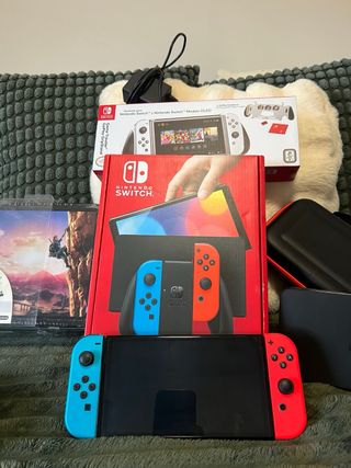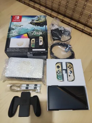 Consola Nintendo Switch OLED, prácticamente nueva y lista para disfrutar. Contiene ticket de compra con la garantía. - Incluye caja original y todos sus accesorios. Conserva todos los plásticos, guarda raíles y HDMI sin estrenar - Protector de pantalla sin usar. - Tarjeta de memoria SanDisk de 128GB exclusiva de Nintendo sin estrenar. - Caja exclusiva The Legend of Zelda: Breath of the Wild. Contiene mando exclusivo, auriculares Nintendo oficiales y gamuza. - Funda de transporte rígida. - Joy-Con adicionales (azul y rojo). - Doc Base de carga para Joy-Cons y jugar en TV. - Adaptador ergonómico sin estrenar . - Funda rígida de viaje