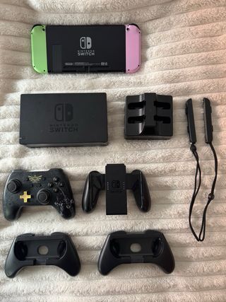 Consola Nintendo Switch con sus accesorios. - Base de carga. - Mandos Joy-Con en azul y rojo. - Mando Pro con diseño de Zelda.