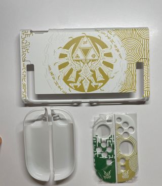 Protege tu Nintendo Switch con esta funda inspirada en The Legend of Zelda. - Diseño blanco con detalles dorados y verdes. - Incluye protectores para los Joy-Con y la consola.