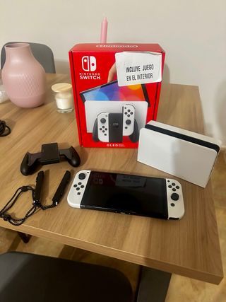 Consola Nintendo Switch OLED en color blanco. Incluye la consola, los Joy-Con, la base, el cargador y el agarre para Joy-Con. - Pantalla OLED de 7 pulgadas. - Almacenamiento interno de 64 GB. - Soporte amplio ajustable. - Caja original como nueva, con sus plásticos. - Sin desgaste en mandos. IMPORTANTE: Aquellos interesados que escriban un mensaje. También se vende a parte una funda de Pikachu.